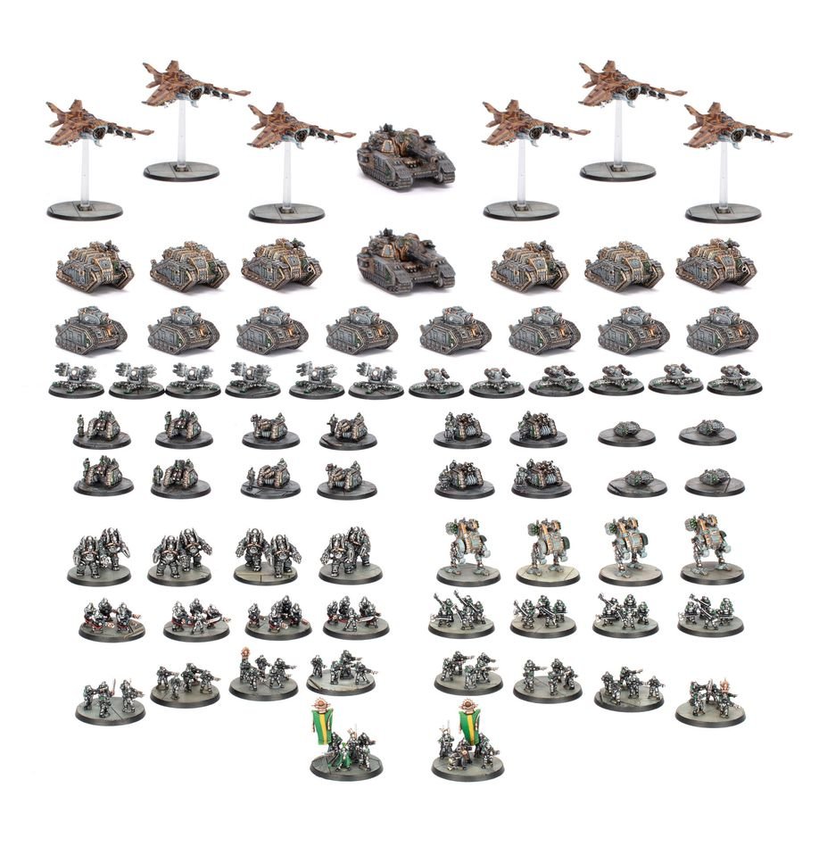 This packed boxed set is ideal for starting a new Solar Auxilia collection – or expanding an existing army – to unleash in games of Legions Imperialis, and save money compared to buying the kits separately. This force is built around a solid core of infantry able to control the battlefield through sheer weight of numbers. Artillery lays down constant barrages of heavy firepower while a contingent of armoured carriers, battle tanks, and super-heavy tanks keeps you mobile. A unit of aircraft rounds out the group, offering rapid response to developing battlefield situations.
