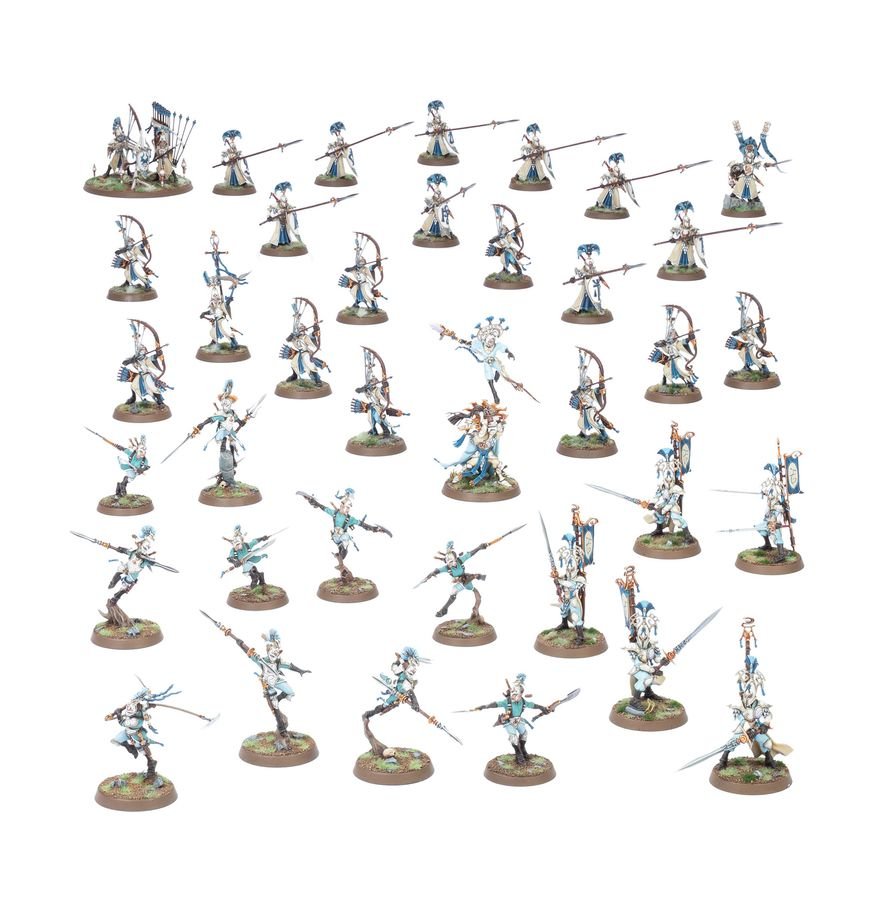 This loaded box is ideal for starting a new Lumineth Realm-lords collection – or expanding an existing army – to restore balance to the Mortal Realms in games of Warhammer Age of Sigmar, and save money compared to buying the kits separately. This large and balanced force is led by Ellania and Ellathor, legendary Eclipsian Warsages who offer magical might and martial prowess. The core of the force is composed of both Vanari Auralan Sentinels and Wardens, providing ranged offence and staunch defence. Supporting them is a unit of fast and slippery Ydrilan Riverblades to claim vital objectives in enemy territory. A unit of elite Vanari Bladelords is ready to take on the toughest enemy units, while a Vanari Starshard Ballista picks off high-value targets from a distance.